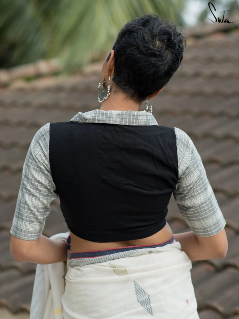 Home Blouse Black Cotton Elbow Sleeve Blouse With V Neck