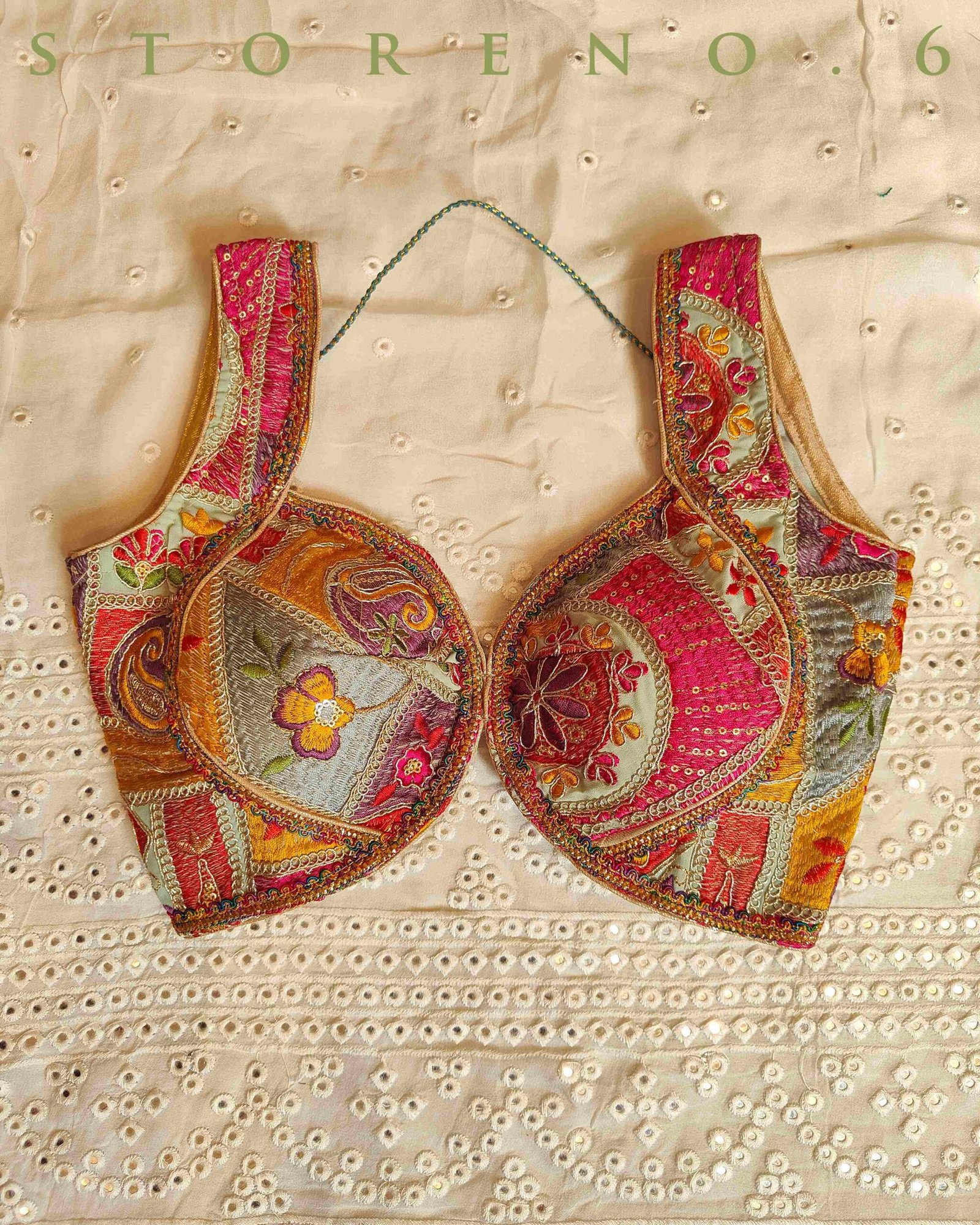 Mint Green Georgette Blouse with Multicoloured Thread and Sequins Embroidery Works. Sleeveless Blouse With Spread V-Shaped Back