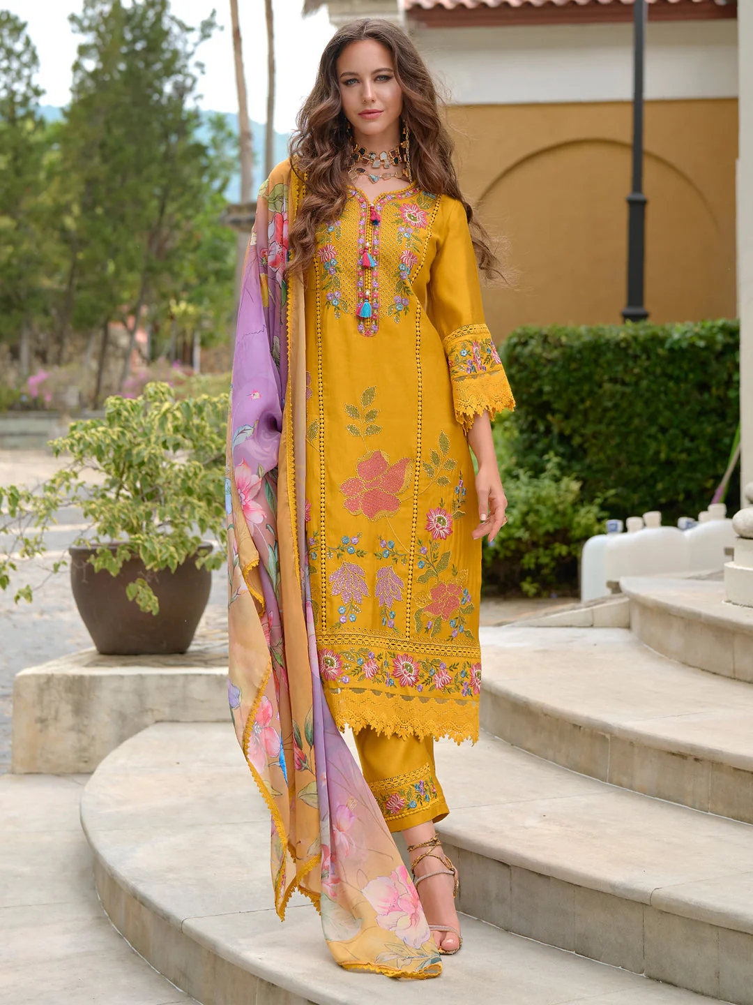 Home Kurtas & Suits Long Kurtas Indo Era Embroidered Straight Kurta Trousers With Dupatta Set