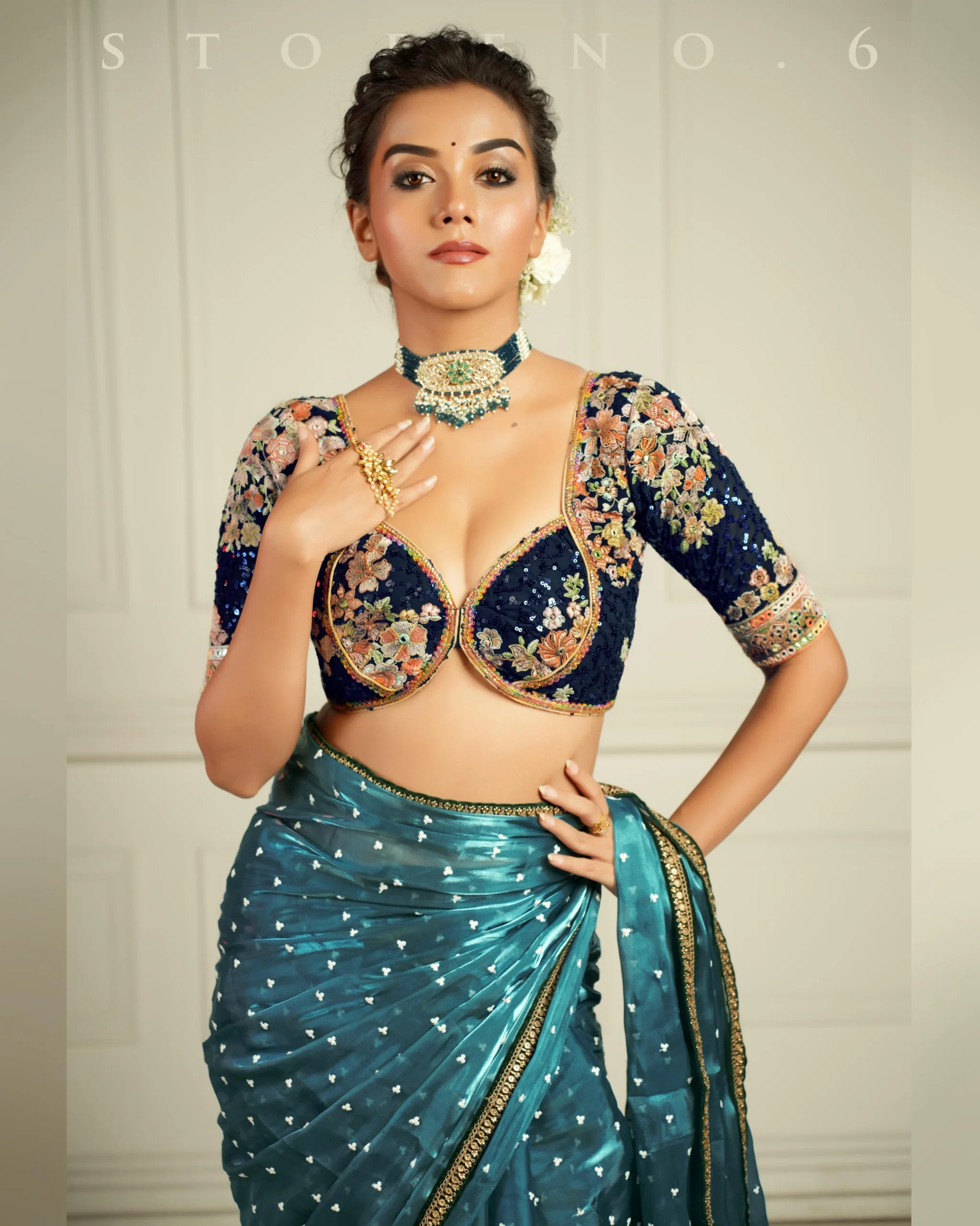 - Blue Georgette Elbow Sleeves Blouse with Multicolour Thread And Sequins Embroidery Works