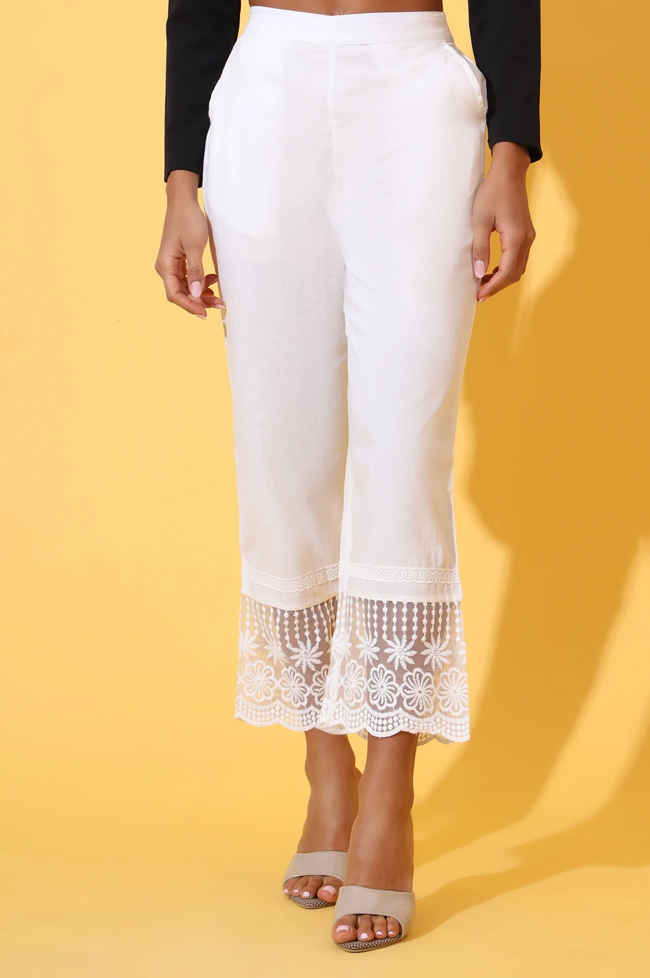Elegantly crafted with intricate schiffli embroidery, this lightweight palazzo offers a perfect blend of comfort and style. The silhouette is designed for effortless movement, along with two side pockets, making it a versatile addition to both casual and formal wardrobes. Ideal for adding a touch of traditional charm with modern flair.